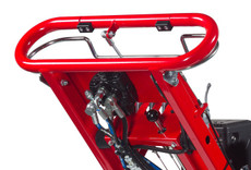 Die Räder werden über Radmotoren angetrieben, deren Drehzahl am Handgriff gesteuert wird.