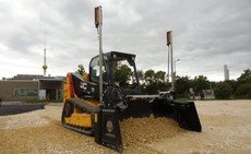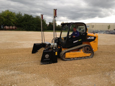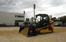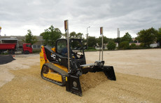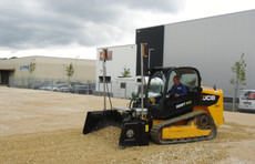 Mit festangebautem, lasergesteuertem Vier-Wege-Planierschild PB 220 und hydraulisch verstellbare Seitentüren.