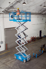 Scherenarbeitsbühne 10 m Arbeitshöhe Plattformverlängerung 91 cm Geländer abklappbar Höhe abgekl. Geländer 168 cm integriertes Ladegerät